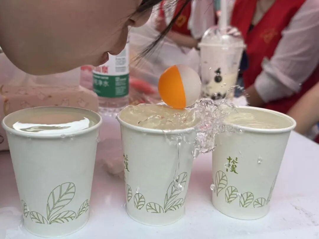 第一环节“四渡赤水”趣味挑战,规则简单却充满挑战性,参与者需在15秒内将乒乓球吹过四个水杯。工作人员提前开放试玩并敲定时限,现场气氛紧张而活跃。