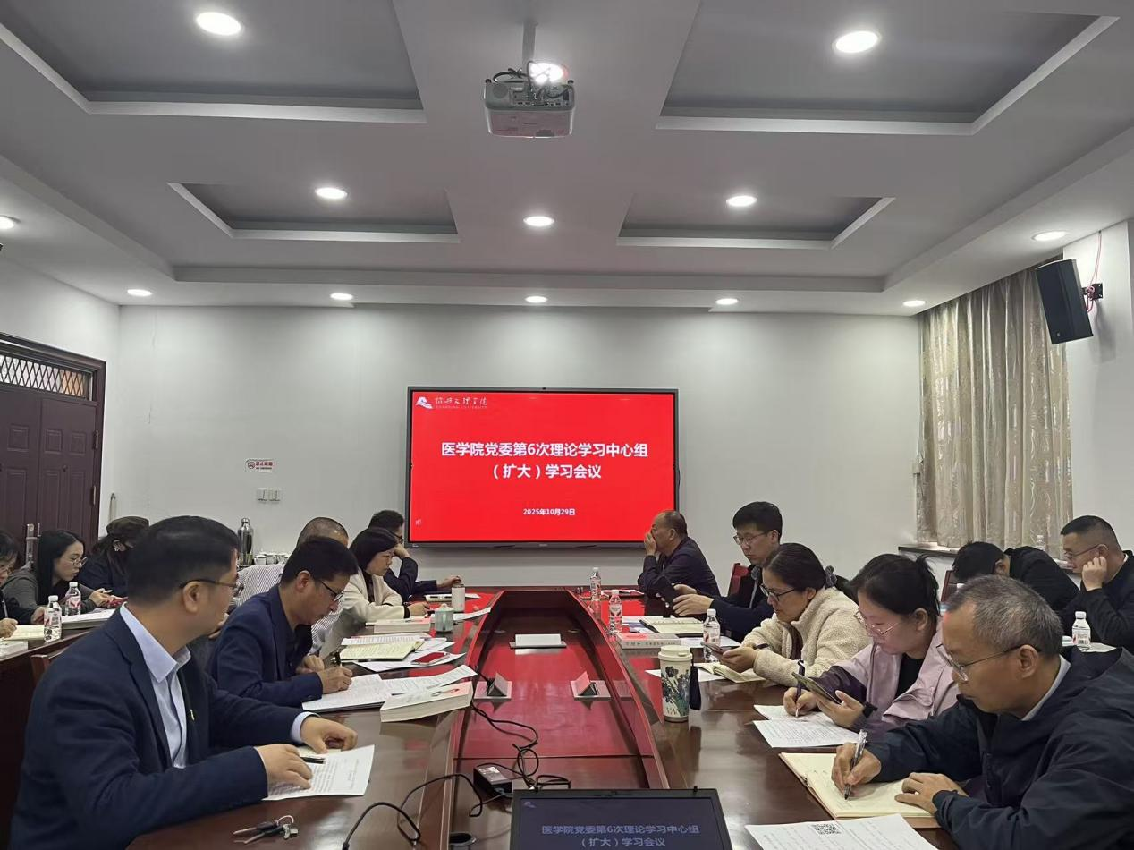 10月29日下午,医学院召开2025年第6次党委理论学习中心组(扩大)学习会议。会议由院党委书记吴剑平主持并领学,集中学习习近平同志《论坚持全面深化改革》第一、二卷及《习近平谈治国理政》相关重要论述,组织观看专题片《文化的力量》。院党委副书记、纪委书记林国旗,院党委委员、教研科科长马国庆作中心发言,中心组成员及全体支部书记参加学习。