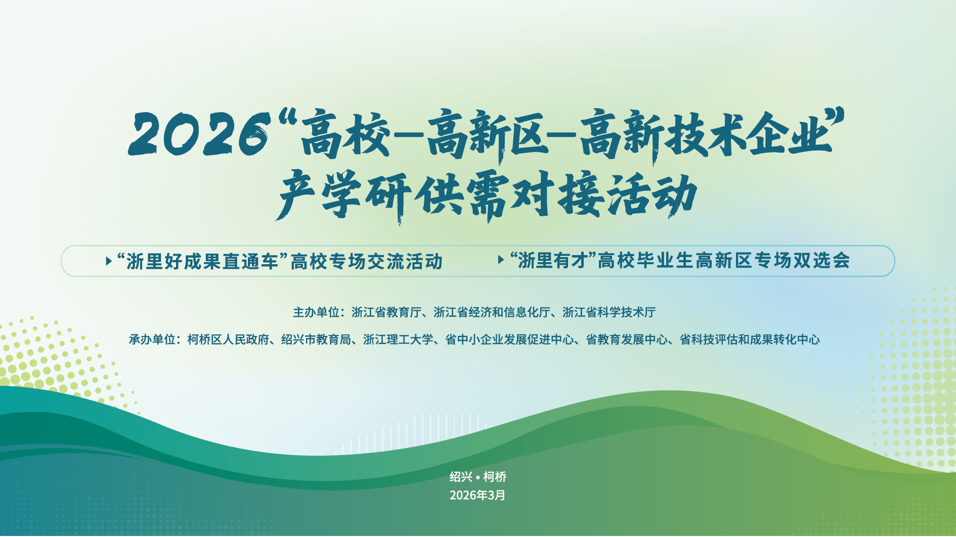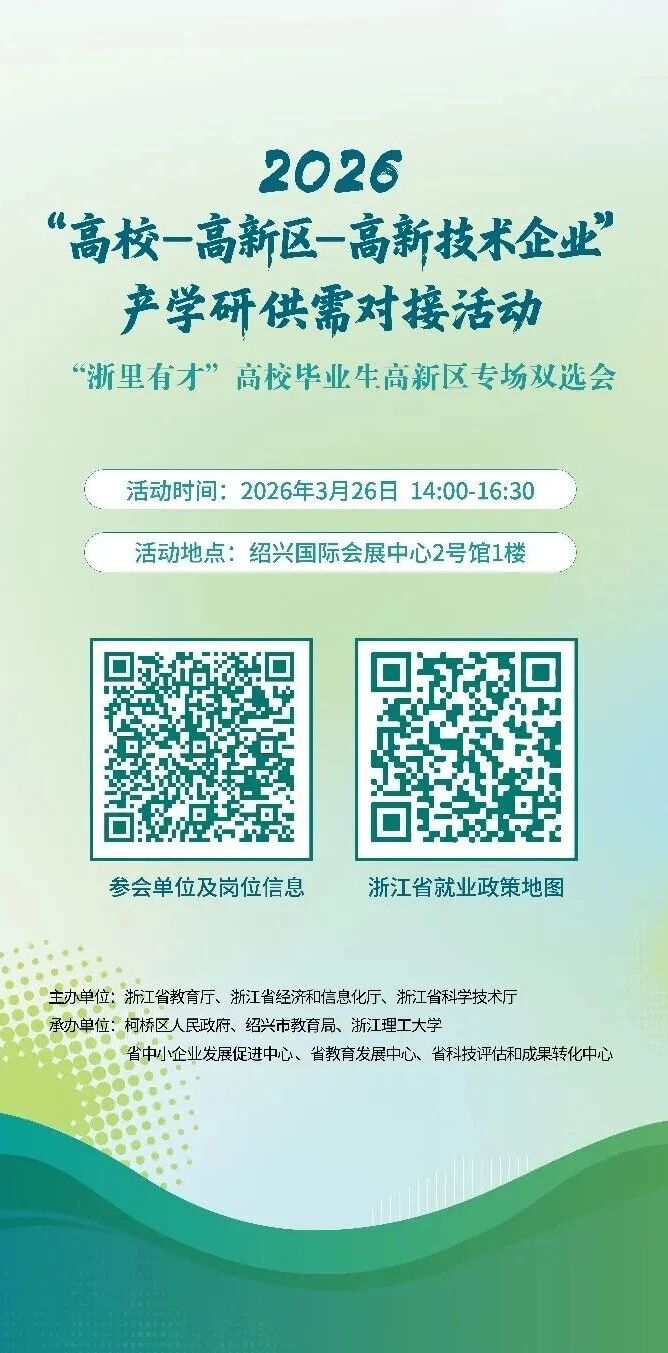 为做深做透创新浙江建设“两篇大文章”,推动高校更好服务高质量发展建设共同富裕示范区,2026“高校—高新区—高新技术企业”产学研供需对接活动暨“浙里有才”高校毕业生高新区专场双选会将于3月26日召开。