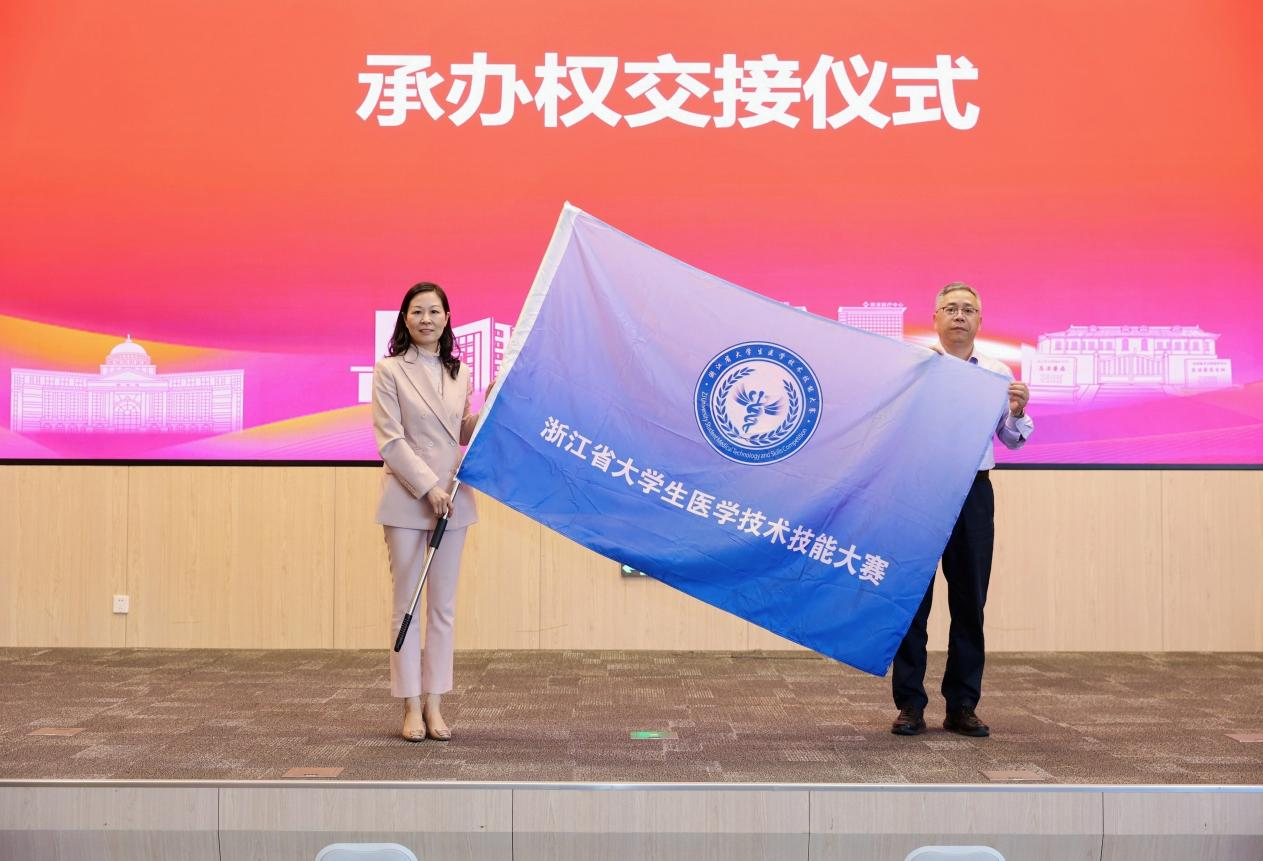 会旗交接仪式环节,大赛组委会郑重地将浙江省大学生医学技术技能大赛赛旗交到柳国庆副校长手中,标志着大赛正式进入绍兴大学主办阶段。