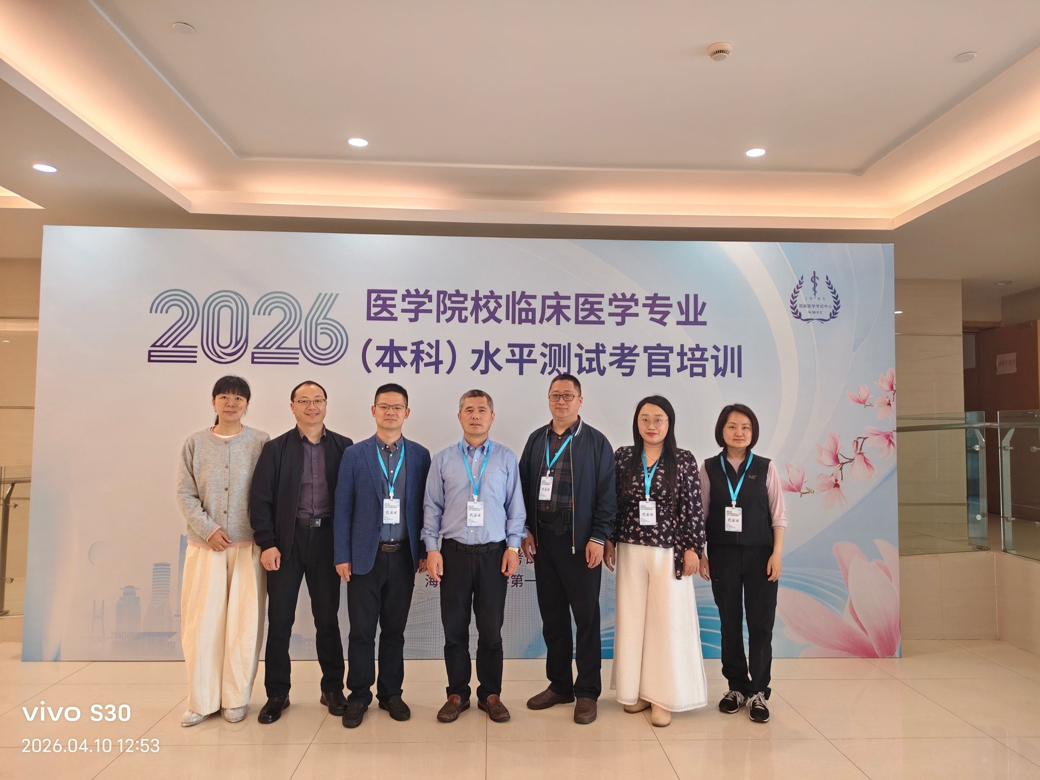 为做好2026年医学院校临床医学专业(本科)水平测试(以下简称“水平测试”)筹备工作,国家医学考试中心于2026年4月10日在上海海军军医大学第一附属医院举办考官培训。我校作为首次参加水平测试的院校,选派临床医学专业主任徐志松、临床医学部副主任(主持工作)董梁、实验中心副主任叶知秋及考站站长、SP负责人等共7人参加此次培训。