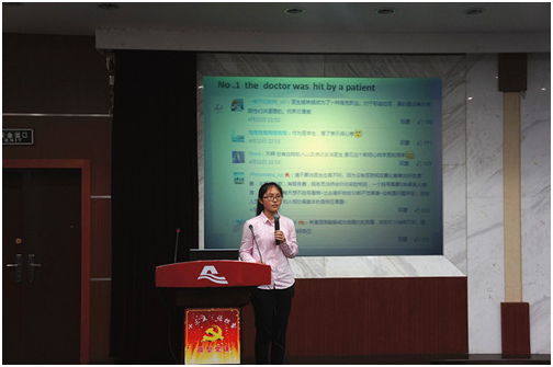 在决赛过程中,选手们围绕着“communication”即沟通这一主题各抒己见,一号选手王珏在主题为“Care with Love,Communicate with Heart”的演讲中谈到了该如何建立良好的护患关系,她认为,应从语言沟通与非语言沟通两个方面来分析,语言沟通包括礼貌用语、多用关心和鼓励的话语等等,非语言沟通也包括面部表情、眼神交流等。二号选手郑浙萍则认为,良好有效的沟通需要正确得当的面部表情、懂得聆听和理解、掌握沟通的技能和控制自身情绪等。选手们准备充分均脱稿演讲,发音标准,语言逻辑性强,仪态落落大方,博得了评委和观众的阵阵掌声。