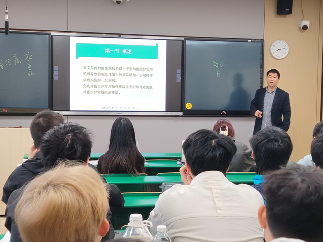 课上,丁院长结合自己多年临床检验一线的经验,从免疫增殖病的病因、发病机制、常见类型与临床表现,到最新免疫学检测技术及进展,层层剖析,让同学们真切体会到这种疾病对患者、家庭乃至社会的沉重打击。其间,他反复强调检验人员“每一份报告都是患者生命”的专业使命,谆谆告诫大家务必在大学阶段夯实理论、精练技能,为成为“合格的检验人”蓄势。最后,丁院长又以多年的带教心得和对学科未来的前瞻判断,为同学们勾勒了大学阶段的成长路线图,并就专业学习与就业规划给出了具体而宝贵的建议。