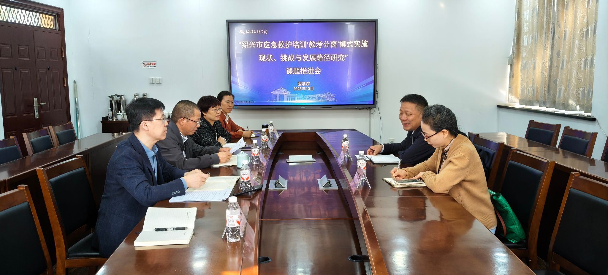 近日,绍兴市红十字会应急救护培训工作“教考分离”课题组在我院组织召开课题推进会,旨在分析现状、明确目标、凝聚共识,全力推动课题研究提速增效。市红十字会副会长、课题组负责人徐泳,院党委书记、红十字会会长吴剑平,副院长邢海燕出席会议,课题组主要成员参加会议。