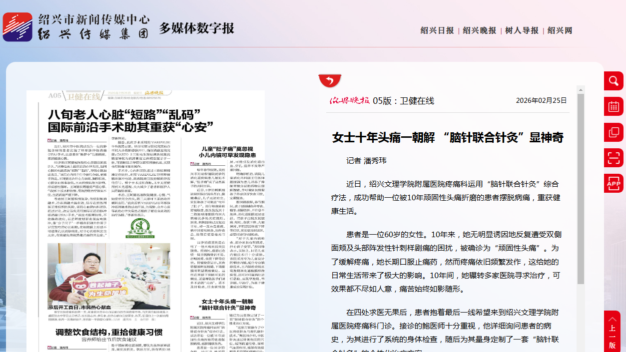 近日,绍兴文理学院附属医院疼痛科运用“脑针联合针灸”综合疗法,成功帮助一位被10年顽固性头痛折磨的患者摆脱病痛,重获健康生活。