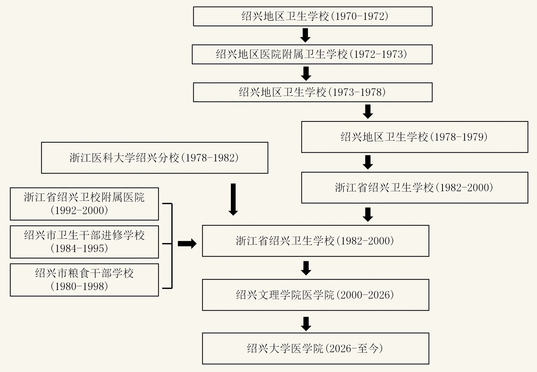 建于1917年的绍兴福康医院护士学校是医学院最早的前身学校。1945年更名为绍兴福康高级护士职业学校。至1952年撤并,历时35年。创建于1947年7月的旧绍属七邑联立高级职业学校,1950年2月更名为“浙江省绍兴医院附设高级护士职业学校”。1951年6月,再次易名为“浙江省立绍兴医院卫生技术学校”。至1952年9月撤并,历时5年。1952年9月,绍兴福康高级护士职业学校和浙江省立绍兴医院卫生技术学校合并成立浙江省绍兴卫生学校。绍兴卫生学校的牌子保留到1999年招收的中专学生毕业时(即2003年7月)为止。1958年6月,绍兴有史以来的第一所高等学校——绍兴医学专科学校建立。至1965年撤并,历时7年。1978年,经浙江省人民政府批准建立浙江医科大学绍兴分校,恢复医专教育。该校于1982年11月停办,历时4年。2000年1月,浙江省教育委员会、浙江省计划与经济委员会经与绍兴市政府研究,批复同意将绍兴卫校并入绍兴文理学院,组建绍兴文理学院医学院。2026年2月,更名为绍兴大学医学院。